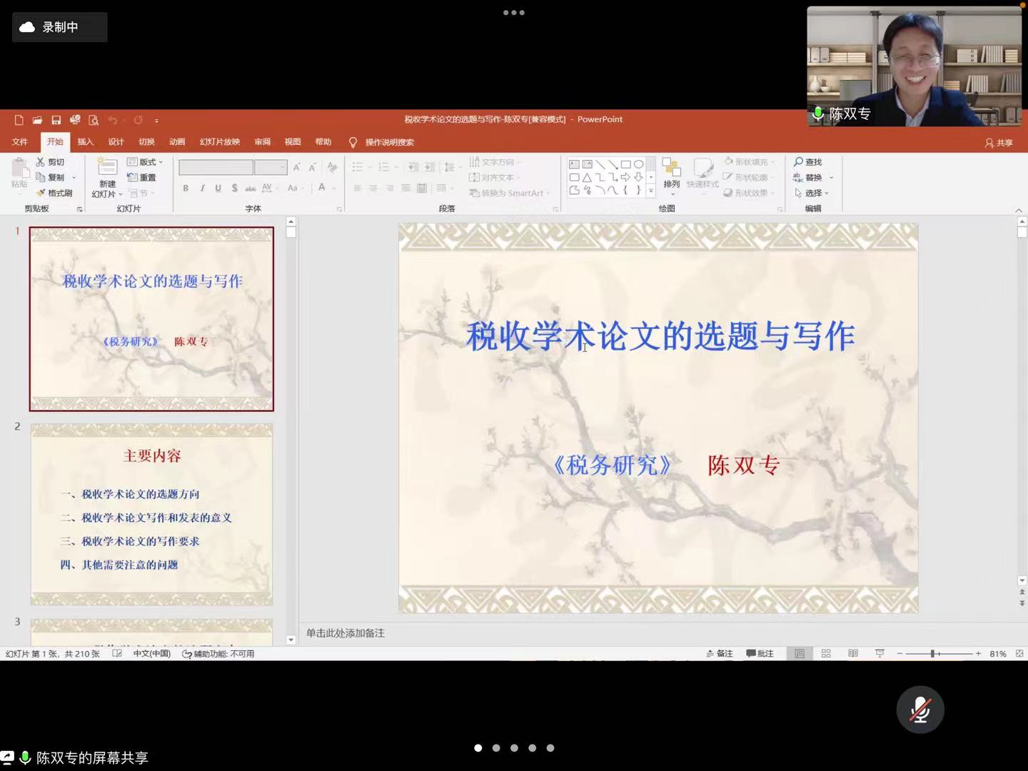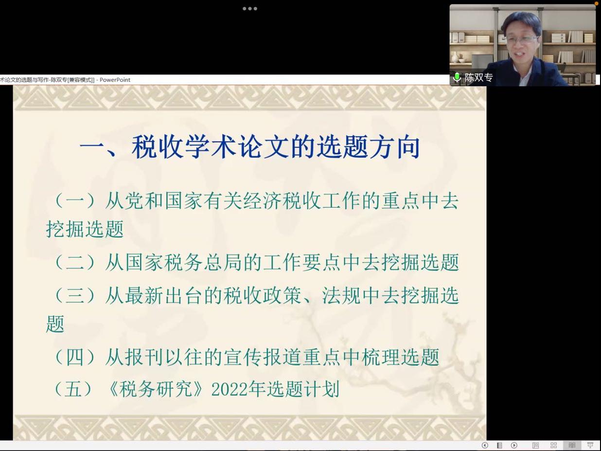 3月23日晚,《税务研究》杂志编辑部副主任(主持工作)陈双专编审应邀分享了主题为“税收学术论文的选题与写作”的讲座。本次讲座由百家乐官网