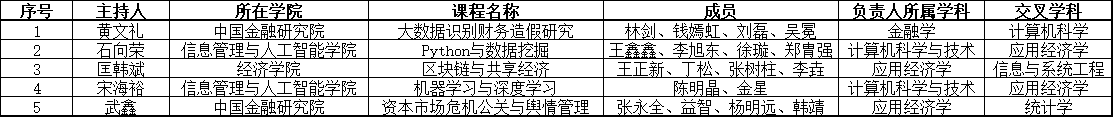为了落实立德树人的根本任务,推动交叉学科人才培养的教学建设,促进跨学科教育内容的深度融合,提高交叉学科研究生教育教学质量,经本人申请、部门推荐、校外专家评审推荐,确定“大数据识别财务造假研究”等5门课程为研究生学科交叉课程建设立项。现将立项结果予以公布(具体名单见附件)。